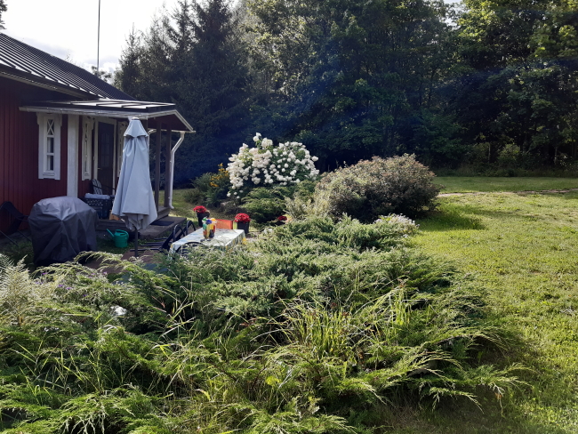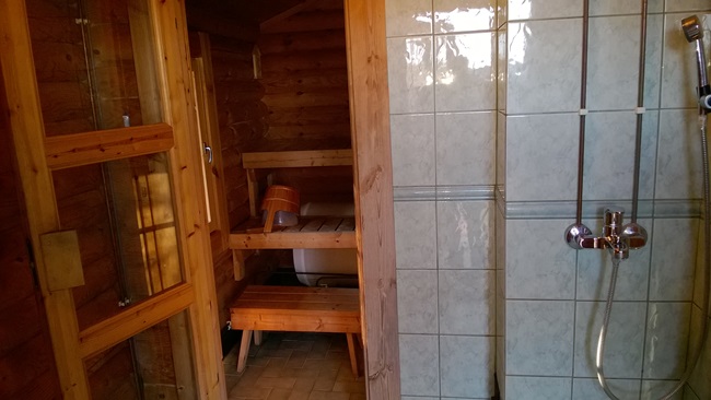 Pihapiirissä on hirsirakenteinen saunarakennus, jossa suihkutilat ja takkahuone sekä erillinen varastorakennus.